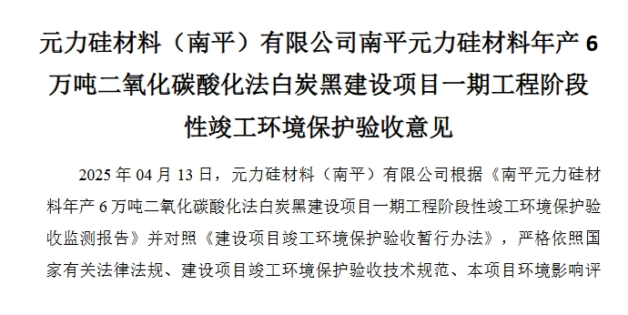 【炭黑產(chǎn)(chǎn)業(yè)(yè)網(wǎng)(wǎng)】6月13日消息,元力硅材料(南平)有限公司年產(chǎn)(chǎn)6萬噸二氧化碳酸化法白炭黑建設(shè)(shè)項(xiàng)目一期工程已順利完成階段性竣工環(huán)(huán)境保護(hù)驗(yàn)收,該項(xiàng)目成功入選了福建省2025年度省重點(diǎn)項(xiàng)目名單。