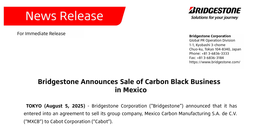 【炭黑產(chǎn)業(yè)網(wǎng)】8 月 5 日消息,繼7月7日,普利司通將位于泰國羅勇的普利司通炭黑(泰國)有限公司(BSCB)出售給東海碳素集團(tuán)的泰國子公司后,普利司通株式會(huì)社于 8 月 5 日對(duì)外宣布,已和卡博特公司達(dá)成協(xié)議,將其旗下全資子公司墨西哥炭黑制造有限公司(MXCB)予以出售。