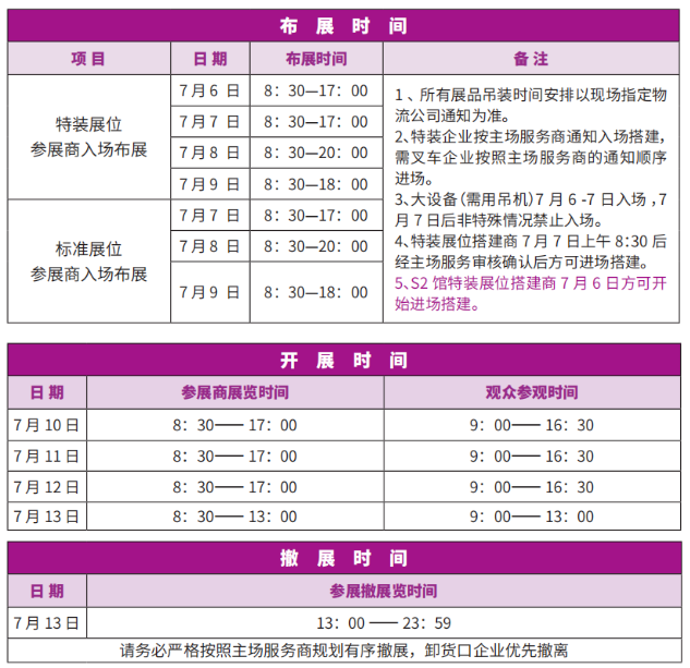 為了您能順利完成布展工作,請認真閱讀《參展商手冊》,本手冊為您提供本屆展覽會的各種相關信息及服務,包括參展流程、貨物進出館、物流吊裝、水電辦理、交通與酒店、展臺搭建、設施租賃等所有信息,以助您順利完成展會期間的各項工作。若您在閱讀過程中有任何疑問,請及時聯系我們。謹祝參展成功!