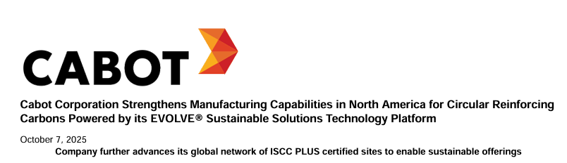 卡博特公司(紐約證券交易所代碼:CBT)于10月7日宣布,已依托其 EVOLVE? 可持續解決方案技術平臺,強化北美地區循環補強炭黑的生產能力。隨著這一里程碑的達成,美國路易斯安那州維爾普拉特生產基地正式加入巴西毛阿、捷克共和國瓦拉什斯凱梅濟日奇(瓦勒梅日奇)生產基地的行列,共同具備經驗證的循環補強炭黑生產能力。該循環補強炭黑采用源自廢舊輪胎的輪胎熱解油為原料,并遵循國際可持續發展與碳認證(International Sustainability & Carbon Certification,ISCC)PLUS 質量平衡方法生產。此外,卡博特已將其全球 ISCC PLUS 認證生產基地網絡拓展至 14 家工廠,在提升經認證可持續解決方案供應能力的同時,進一步推進公司對循環型可持續經濟的承諾。