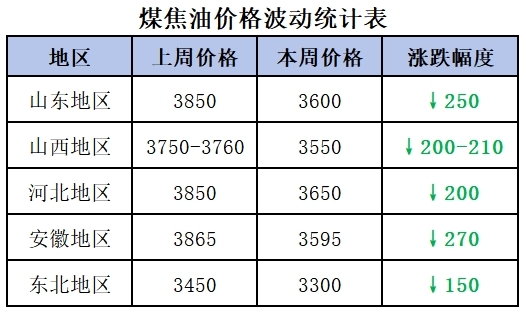 短期內(nèi)焦化廠依舊保持盈利,且尚無主流焦企大面積減產(chǎn)消息,市場煤焦油供應(yīng)延續(xù)穩(wěn)定。據(jù)炭黑產(chǎn)業(yè)網(wǎng)觀察,本周煤焦油價格顯著下滑,這主要是由于深加工產(chǎn)品跟漲乏力,以及終端需求不佳所導(dǎo)致。周內(nèi),深加工主產(chǎn)品均呈現(xiàn)下滑趨勢,尤以煤瀝青和蒽油的降幅最為顯著,深加工企業(yè)虧損局面加大,對煤焦油采購情緒消極,焦企挺價困難。