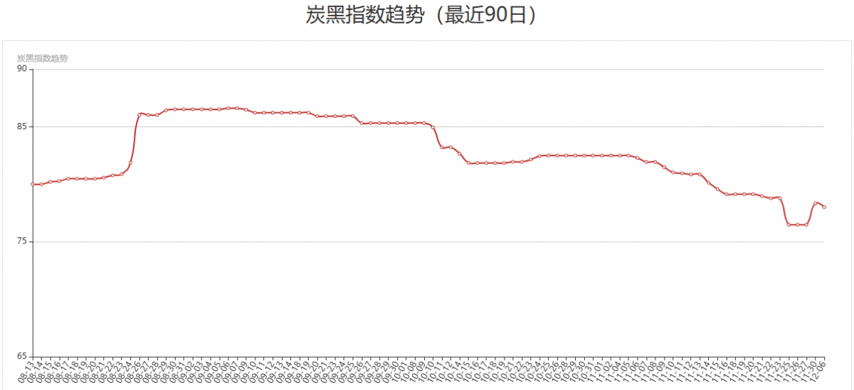 炭黑產(chǎn)業(yè)網(wǎng)根據(jù)市場N330/N220/N550三個牌號最新市場成交價格,并分別按一、二、三線品牌權(quán)重分配計算后得出今日最新炭黑指數(shù)為78.01,與之前相比炭黑指數(shù)依然維持在低谷區(qū)間。